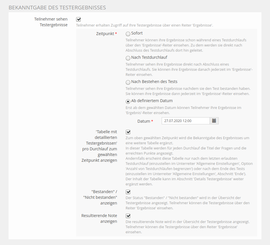 Zusätzlich kann der Zeitpunkt festgelegt werden, ab wann die Ergebnisse einsehbar sind (sofern eine Ergebniseinsicht gewünscht ist). Dieser sollte sinnvollerweise nach dem Ende des Zugangs und noch vor dem Ende der Verfügbarkeit liegen, somit gilt: