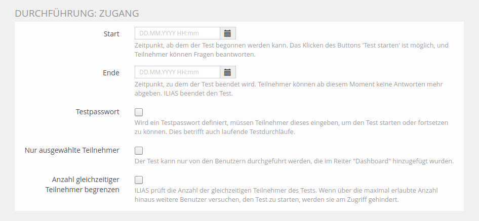 Zugang: legt fest, in welchem Zeitraum der Test gestartet und bearbeitet werden darf.