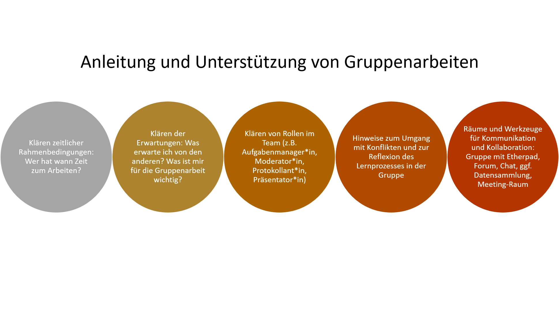 Nun beginnen die Gruppen ihre Arbeit aufzunehmen. Wie hier das Vorgehen sein wird, hängt auch davon ab, wie umfangreich die Aufgabenstellungen sind, über welchen Zeitraum die Gruppen zusammenarbeiten werden und in welchem Umfang die selbständige Arbeit in den Gruppen durch synchrone Arbeit/Treffen in Präsenzveranstaltungen/sychronen Online-Meetings flankiert wird. Vor allem bei umfangreichen Projektarbeiten, die sich über einen längeren Zeitraum erstrecken, ist es von zentraler Bedeutung, die Motivation der Teilnehmenden aufrecht zu erhalten. Hier empfiehlt es sich, regelmäßige (Meilenstein-) Termine zu vereinbaren, bei denen Zwischenstände der Bearbeitung, Fragen oder sich ergebende Schwierigkeiten besprochen werden können.