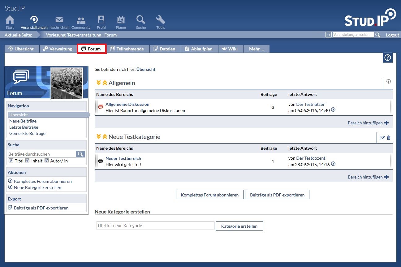 Textbasierte zeit- und ortsunabhängige Möglichkeit zum Austausch von Gedanken, Meinungen und Erfahrungen. Lehrende und/oder Studierende können parallel zu Veranstaltungsthemen Fragen stellen, die in Form von Textbeiträgen besprochen werden können. Diese Beiträge können von allen Teilnehmenden der Veranstaltung gemerkt, verlinkt, positiv bewertet (sog. "Gefällt mir") und editiert werden (Letzeres nur von Lehrenden). Lehrende können zusätzlich Themen in Bereiche gliedern, zwischen den Bereichen verschieben, im Bereich hervorheben und diesen öffnen und schließen.