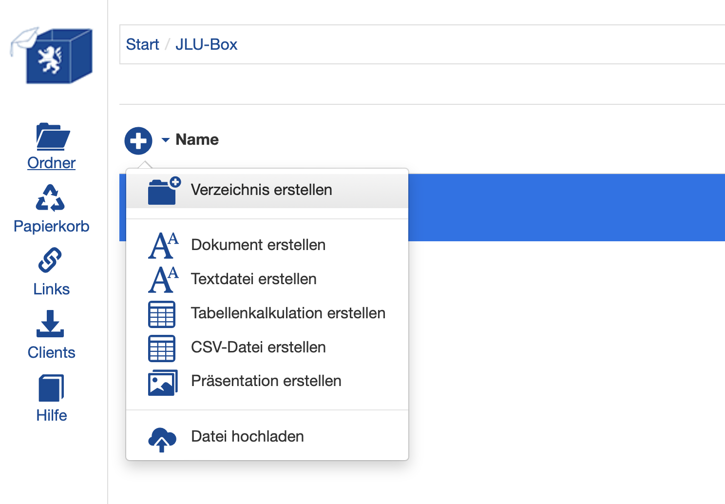 - Ordner erstellen: Erstellen Sie zunächst einen neuen Ordner in der JLU-Box, in dem Sie Ihre Videodateien ablegen. Der Ordner kann nach dem jeweiligen Kurs, Projekt oder Thema benannt werden.