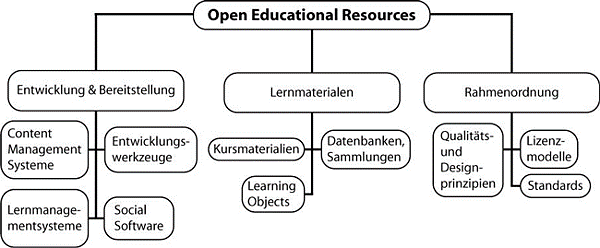 Als OER können verschiedene Formen wie Kurse, Kursanwendungen, Kursmodule, aber auch Textdateien, Bilder, Audio, Video, Simulationen usw. verstanden werden. Eingeschlossen sind auch Tools wie Lernmanagementsysteme oder Trainingsmaterialien zur Verwendung oder Qualitätssicherung von OER. Insgesamt können OER zum einen nach dem Materialientyp (Software, Publikationen, Kurse usw.) und zum anderen auf Grund ihrer Medienformate unterschieden werden. Im Kontext von Lernmaterialien werden Softwareanwendungen und Standards benötigt, die die Entwicklung, die Verwendung und Wiederverwendung der Lerninhalte unterstützen (vgl. www.e-teaching.org/didaktik/recherche/oer).