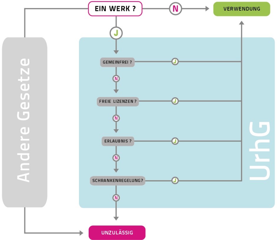 In einem ersten Schritt wird geprüft, ob es sich überhaupt um ein Werk handelt. Nur wenn ein Werk vorliegt, ist der Anwendungsbereich des Urheberrechtsgesetzes eröffnet. Liegt kein Werk im Sinne des Gesetzes vor, so kann es verwendet werden. Zu beachten ist jedoch, dass sich Schutzrechte aus anderen Gesetzen ergeben können.