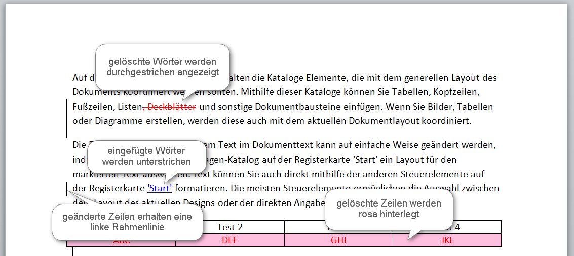 Nachverfolgung von Änderungen in Microsoft Word 2010. Das Beispiel zeigt nur eine Auswahl von Möglichkeiten.