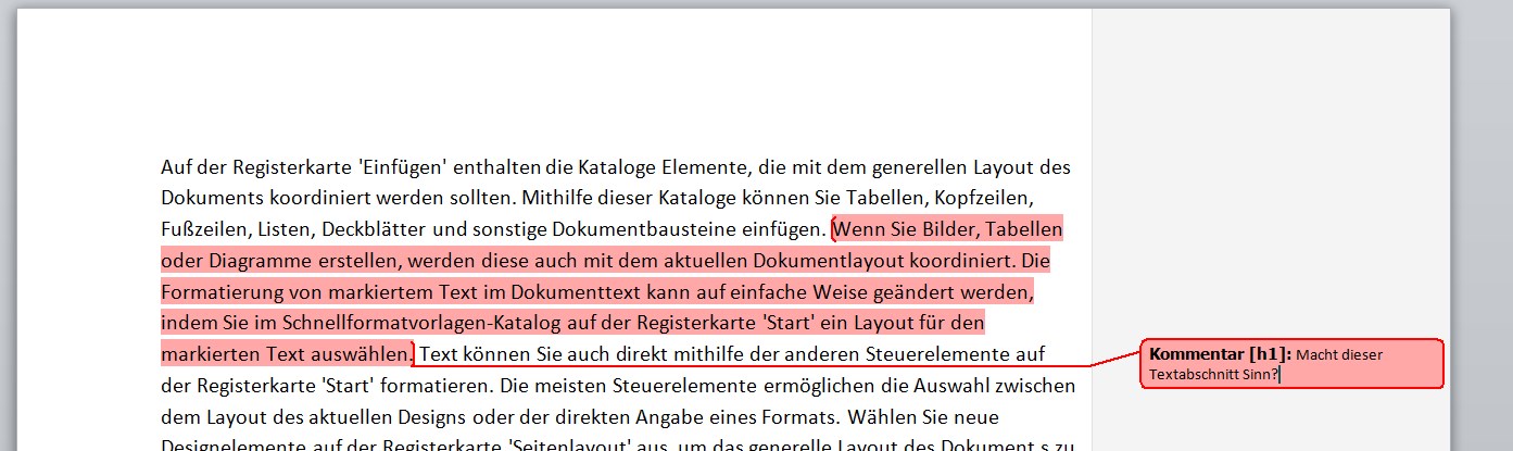 Einfacher geht es, wenn Sie diese Versionierung durch die Überarbeitungsfunktion Ihres Textverarbeitungsprogrammes übernehmen lassen. Diese Funktion zeigt gelöschten Text als durchgestrichenen Text an, der damit weiterhin sichtbar bleibt. Wenn Sie die Löschung rückgängig machen wollen, haben Sie mit der Überarbeitungsfunktion mit einem Klick die Möglichkeit dazu. Gleiches gilt für die Kommentarfunktion, wenn Sie mit mehrere Personen an einer Gruppenarbeit schreiben.