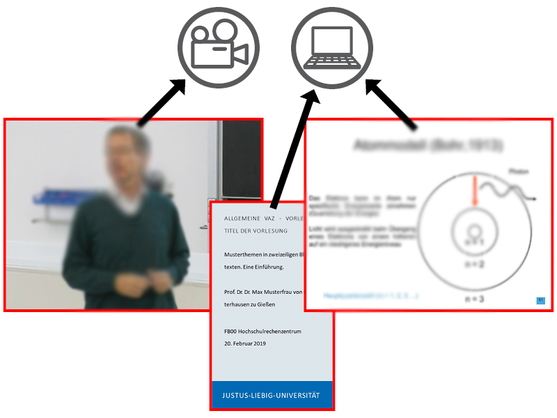 Die Vorträge der Lehrperson werden mit einer Videokamera aufgezeichnet - die während des Vortrags genutzten Medien werden hingegen direkt auf dem verwendeten Computer aufgezeichnet.