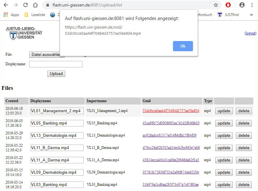 Nach erfolgreichem Upload erhaltet ihr über einen Klick auf die Spalte GUID einen Link zur Videodatei. Diese Video-Adresse gibt an, wie ILIAS auf das Video auf dem Flash-Server zugreifen kann. Kopiert ihn, damit ihr ihn im nächsten Schritt in ILIAS einfügen könnt.
