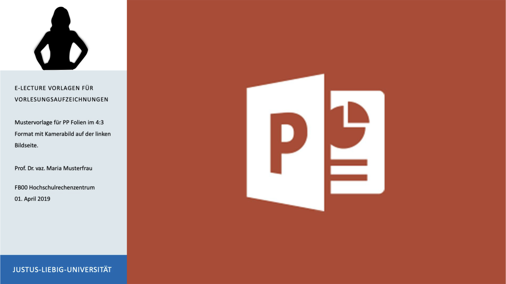 Das gängigste Format der Veranstaltungsaufzeichnung, wie sie auch vom Hochschulrechenzentrum der JLU angeboten wird, zeigt die sprechende Person als kleines Videobild neben der aktuell besprochenen PowerPoint Folie. Der Ton der Lehrperson wird dabei in der Regel von der Videokamera aufgezeichnet, bei großen Hörsälen werden zudem die Mikrofone der jeweiligen Saalanlagen verwendet.