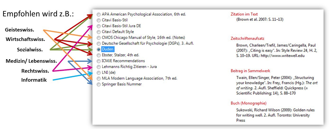 In den meisten meisten wissenschaftlichen Fachgebieten werden ganz bestimmte Zitationsmethoden und -stile verwendet. Wenn ihr daher einen passenden Stil einsetzt, sollten eure Dozierenden mit euch zufrieden sein. Wichtig ist jedoch, dass ihr konsistent zitiert, d.h. nicht zwischen verschiedenen Stilen wechselt. Wenn íhr Citavi von Anfang an einsetzt und auch mit euren Dokumenten verbindet, kann nicht viel schiefgehen. Citavi sorgt für die einheitliche Darstellung aller Literaturangaben und die eingebauten Zitationsstile bringen für jeden Publikationstyp (Artikel, Buch, ...) die passende Ausgabe schon mit.