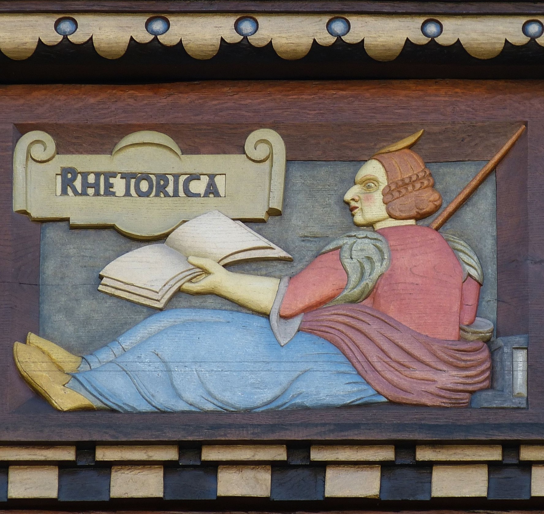 | ![]() Die Gestalt RHETORICA mit Buch in der Hand, ein Bild am Wedekindhaus in Hildesheim. (Quelle: falco | Pixabay.com) |