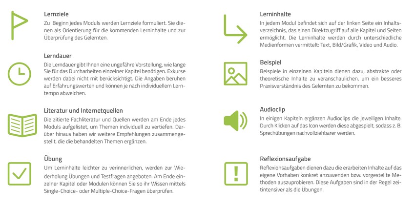 Das Lernmodul Wissenschaftliche Forschungsmethoden ist folgendermaßen strukturiert: Am Anfang werden die Lernziele und Inhalte genannt sowie eine ungefähre Lerndauer angegeben. Im Modul selbst werden Sie immer wieder Übungen und Denkaufgaben, Beispiele oder Video- bzw. Audioclips finden, die zur Vertiefung der Lerninhalte dienen. Am Ende finden Sie eine Liste mit der verwendeten Literatur sowie weitergehende Literaturempfehlungen.