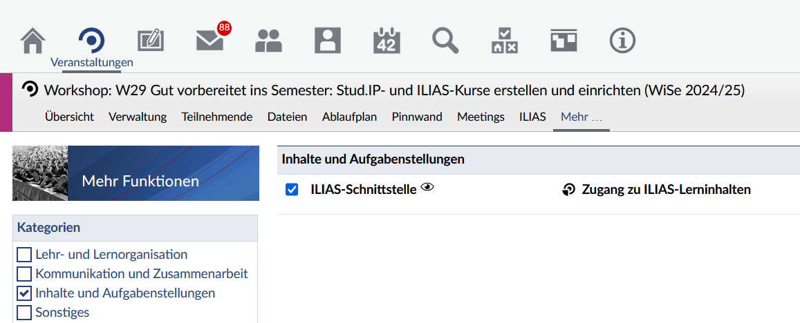 Um einen ILIAS-Kurs anzulegen, muss in der jeweiligen Stud.IP-Veranstaltung die Schnittstelle zu ILIAS aktiviert werden. Das tun Sie, indem Sie im Bereich "Mehr" im Abschnitt "Inhalte" ein Häkchen bei der "ILIAS-Schnittstelle" setzen.