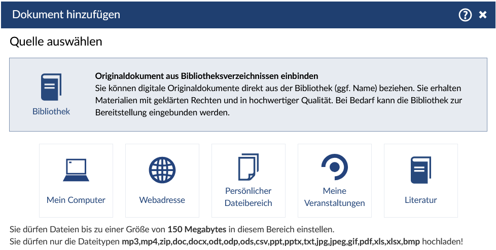 Beim Hochladen einer Datei können Sie aus mehreren Dateiquellen auswählen. Sie können Dateien laden