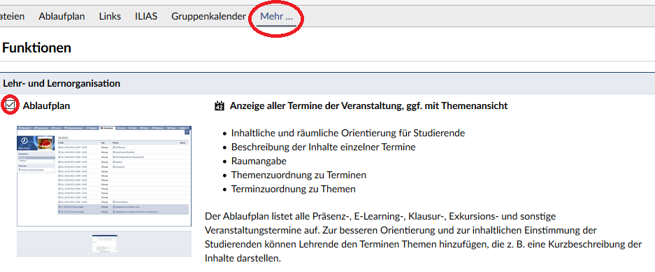 Wenn Sie einen regelmäßigen Termin für Ihre Veranstaltung angelegt haben, können Sie zusätzlich auch Themen und Beschreibungen zu den einzelnen Sitzungen angeben. Gehen Sie hierzu zunächst auf den Reiter "Ablaufplan" in Ihrer Veranstaltung. Falls dieser Reiter nicht vorhanden sein sollte, fügen Sie den Ablaufplan über "Mehr..." hinzu.