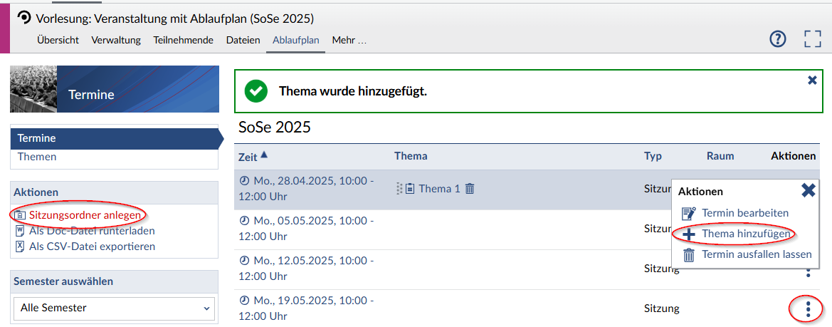 Wenn Sie auf den Reiter "Ablaufplan" klicken, sehen Sie, dass zu jedem der Termine Ihrer Veranstaltung ein Eintrag existiert. Diese Einträge können Sie weiter bearbeiten und beispielsweise ein Thema für einen Termin hinzufügen und eine Beschreibung.