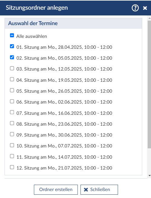 Darüber hinaus können Sie auswählen, ob und zu welchen Terminen Sitzungsordner angelegt werden sollen.