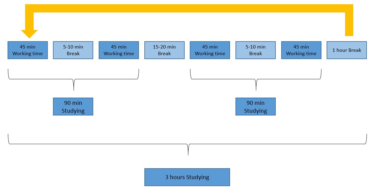 You are entitled to a short break after each 45-minute work session. Initially 5-10 minutes, after a total of 90 minutes of work (that is, after two sessions of 45 minutes each), a break of 15-20 minutes is scheduled. After a total of 3 hours of learning, it is time for an extended break of at least 1 hour.