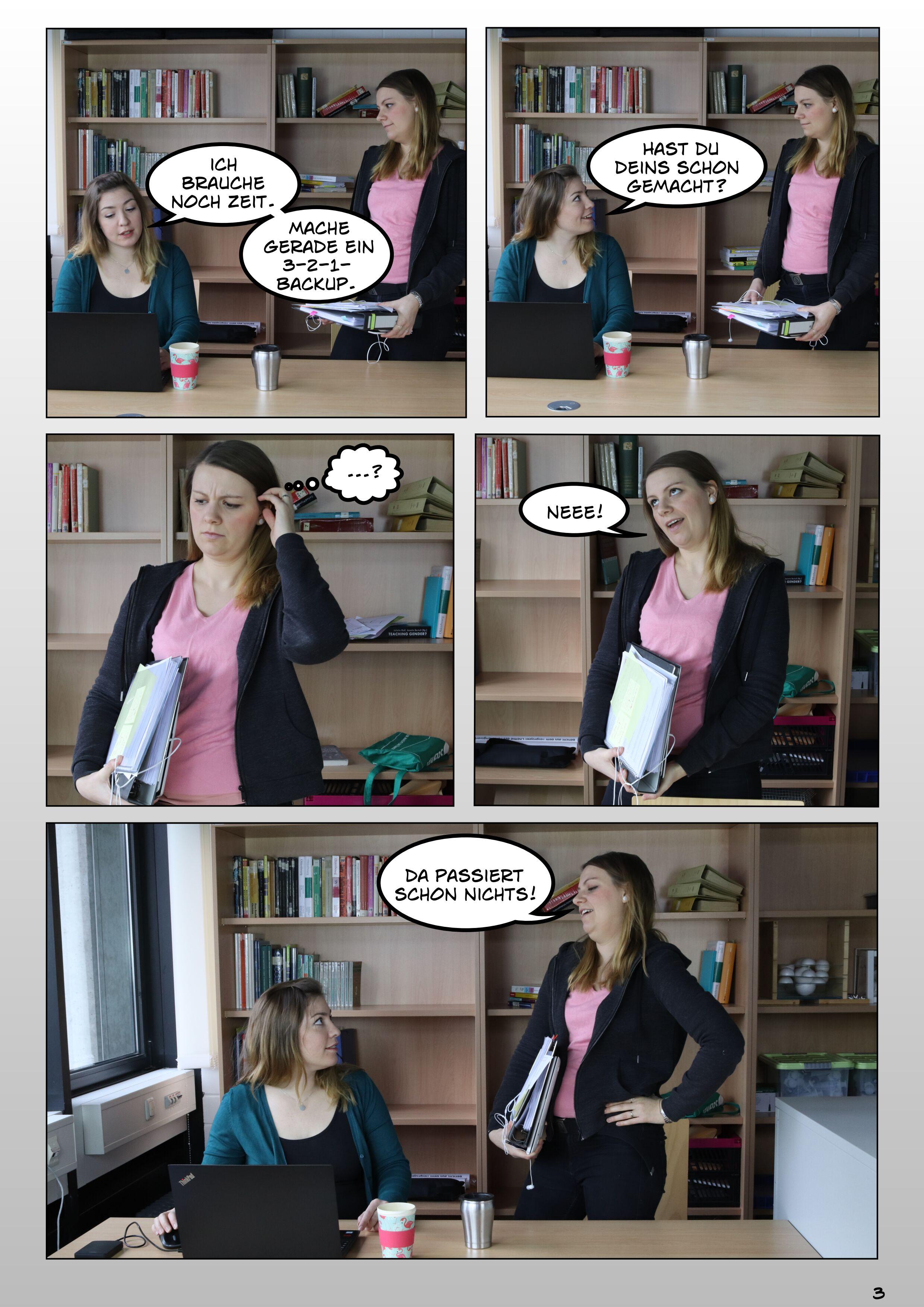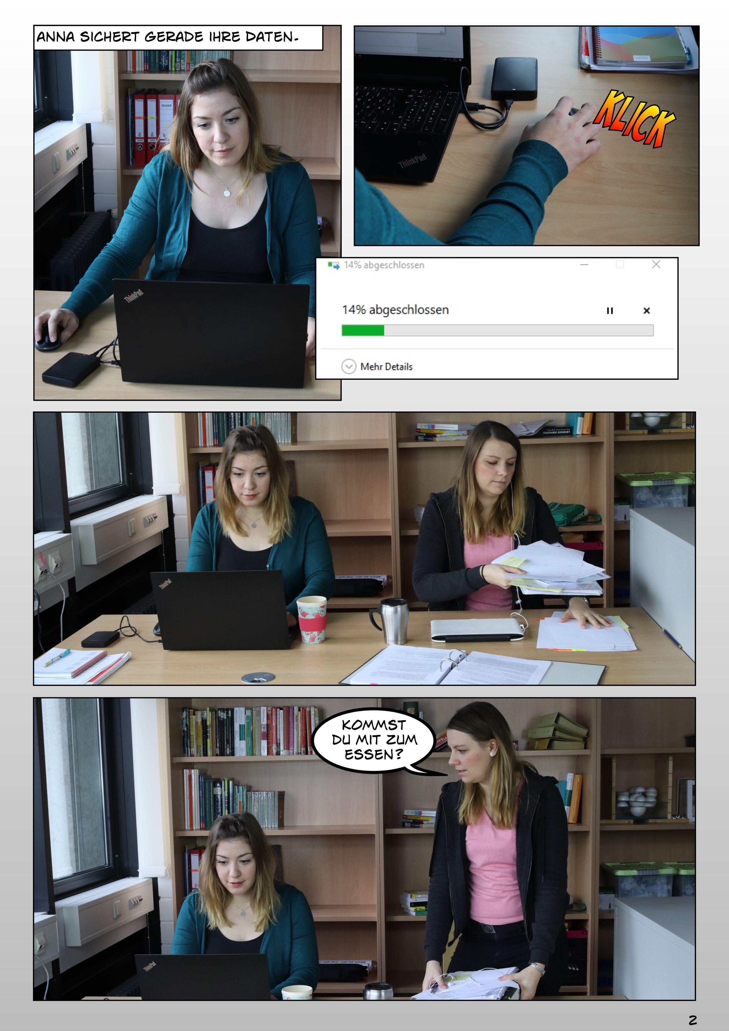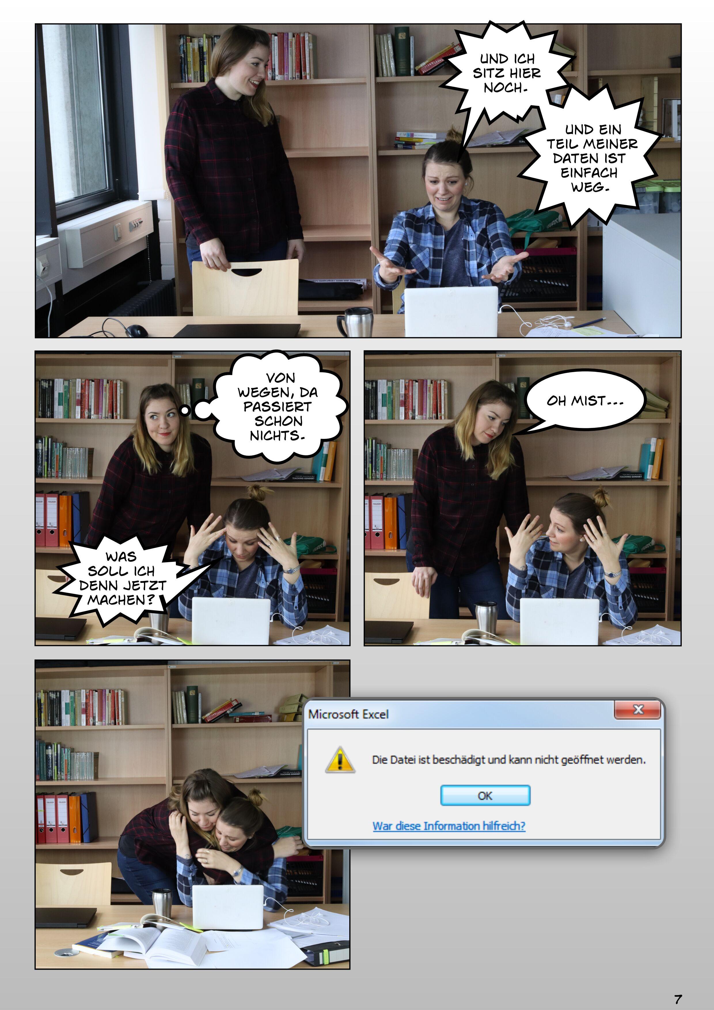 Abb. 1.1: Stress lass nach. Eine Bildergeschichte zum Forschungsdatenmanagement. Erstellt von Julia Werthmüller und Tatjana Jesserich, Projekt FOKUS, Forschungsdatenkurse für Graduierte und Studierte, 2019. CC BY-SA 4.0 Gefördert vom BMBF 2017 bis 2019.
