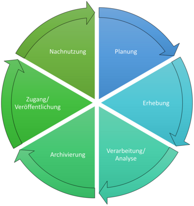 Der Forschungsdatenlebenszyklus ist eine Visualisierung des Forschungsprozesses, bei der speziell die Rolle der Daten in den Blick genommen wird. Er zeigt, dass ein professioneller Umgang mit Forschungsdaten mehr beinhaltet als nur Erhebung und Analyse. Für Forschende lohnt es sich, in Entscheidungen immer alle Phasen mitzudenken und sich schon frühzeitig zu informieren, welche Tools und Möglichkeiten es gibt, um Ihre Praxis im Umgang mit Forschungsdaten zu optimieren.