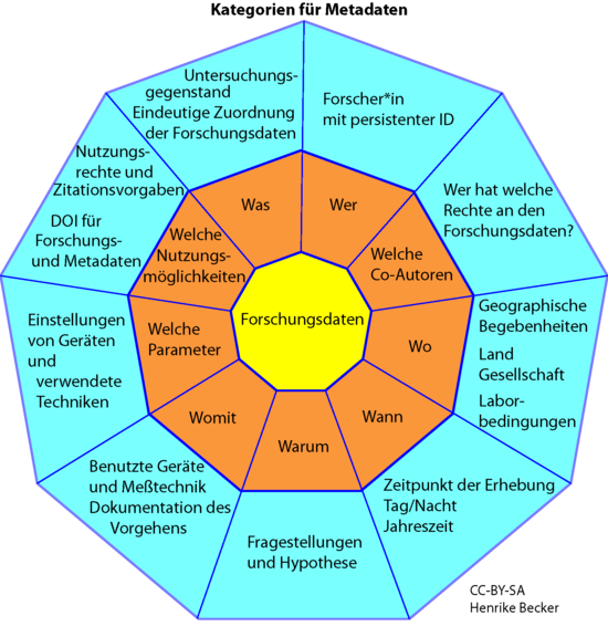 Es gibt sehr viele verschiedene Kategorien, die durch Metadaten beschrieben werden können und oft auch müssen. Je nach Disziplin und Forschungsdaten können sich diese Kategorien stark unterscheiden, manche gelten aber als Standardkategorien für alle Disziplinen.