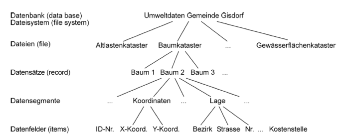 Auf der untersten Ebene der Datenorganisation befinden sich Datenfelder. Diese enthalten Attributwerte, nach denen sie logisch zusammengehörend Datensegmenten (Datengruppen) zugeordnet werden können. Mehrere Datensegmente bauen einen Datensatz auf. Logisch zusammengehörende Datensätze bilden dann eine Datei, während zusammengehörige Dateien Dateisysteme / Datenbanken bilden.