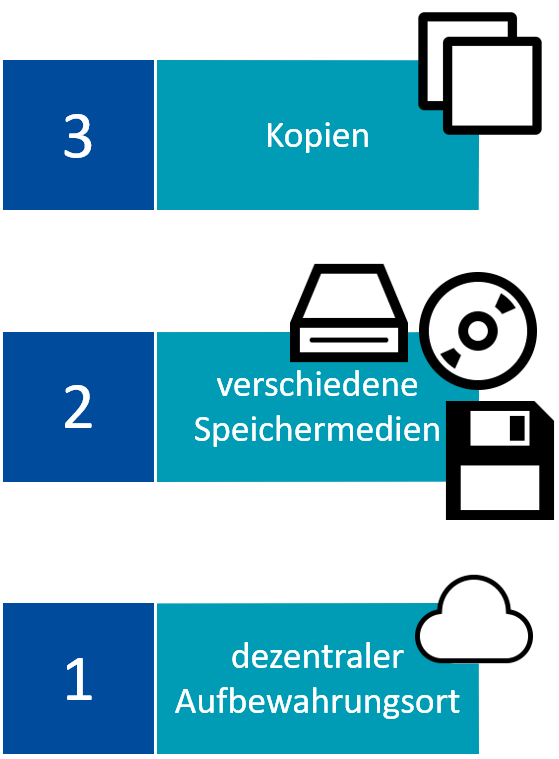 Es empfiehlt sich, eine automatisierte Routine zu verwenden. Partielle Daten, an denen derzeit gearbeitet wird, sollten möglichst täglich gesichert werden. Zudem ist es ratsam, diese nicht täglich zu überschreiben, da man so gegebenenfalls Fehler rekonstruieren kann oder auch Änderungen, die fälschlicherweise durchgeführt wurden, rückgängig machen kann. Zusätzlich sollte ein wöchentliches Gesamtbackup erstellt werden. Die Grundsätze der 3-2-1 Backup-Regel sind hierbei nützlich (s. Abb. 8.1).