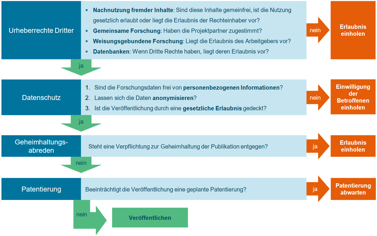 Nicht alle Forschungsdaten dürfen oder sollten auch tatsächlich veröffentlicht werden. Bevor Sie ggf. gänzlich auf eine Veröffentlichung verzichten, sollten Sie in jedem Fall prüfen, ob Sie Maßnahmen ergreifen können um eine rechtlich und ethisch unbedenkliche Veröffentlichung doch noch zu ermöglichen. Einen Überblick über mögliche rechtliche Hürden und entsprechende Lösungen gibt folgende Abbildung: