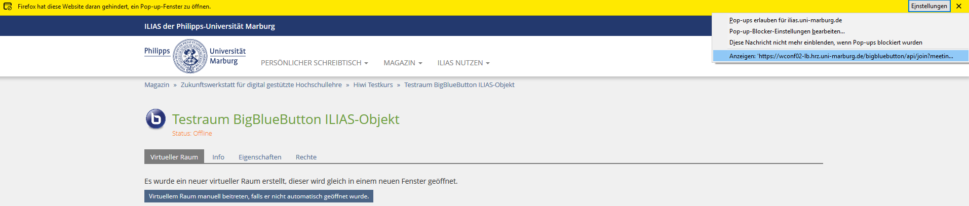 When opening a BigBlueButton room in ILIAS, your browser may warn you that a pop-up is about to open. You may need to allow this in order to access the BigBlueButton room. Please see the screenshot below.