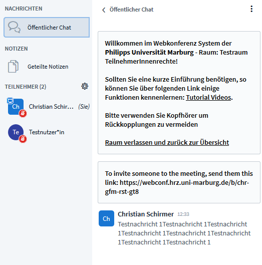 If a BigBlueButton room is created in ILIAS, an individual welcome text can be created for the room, which will appear above the public chat. Use the function "Welcome text" in the tab "ILIAS object properties".