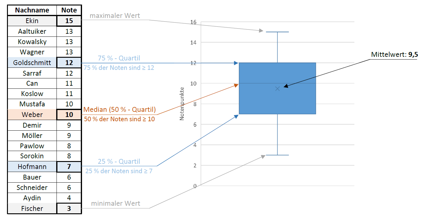 Beispiel: In einem Seminar wurde eine Klausur geschrieben. Der Seminarleiter möchte für seine Studierenden graphisch darstellen, wie sie ihre Notenpunkte im Vergleich zu den anderen einordnen können. Dazu hat er einen Boxplot erstellt.
