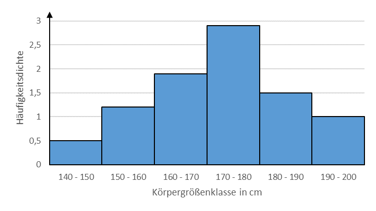 Beispiel: Für einen Sportwettkampf sollen die Teilnehmer*innen in Gruppen entsprechend ihrer Körpergröße unterteilt werden. Aus diesem Grund müssen alle Teilnehmer*innen bei der Anmeldung ihre Körpergröße angeben. Um besser abschätzen zu können, wie groß die Gruppen werden, erstellen die Veranstalter*innen eine Tabelle und ein Histogramm, welche Auskunft über die Größenklassen sowie die Anzahl der Teilnehmer*innen geben.