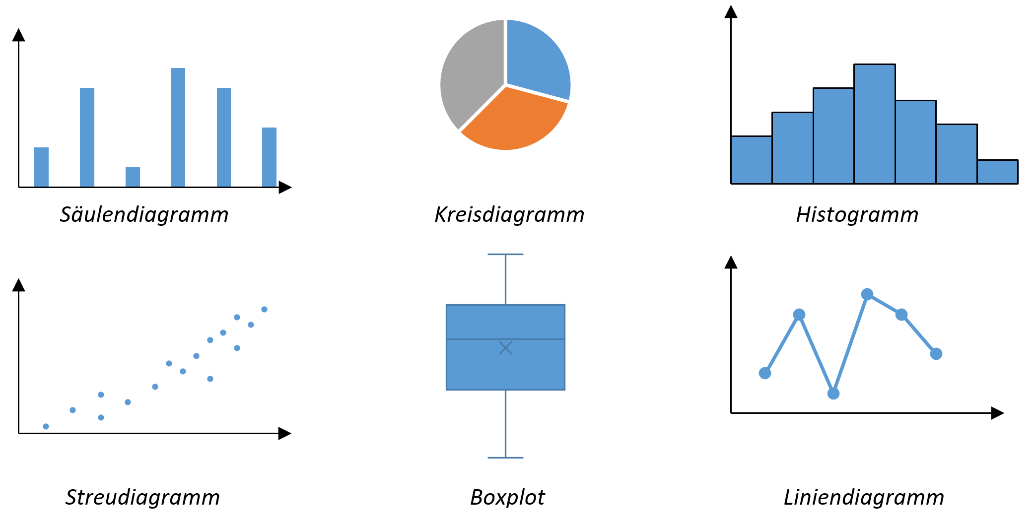 In diesem Teil sollen Sie einen Überblick darüber erhalten, welche Diagrammtypen für welche Art von Daten und welchen Zweck geeignet sind. Aus der großen Auswahl an Diagrammen werden wir uns der Übersichtlichkeit halber auf die Diagrammtypen Säulendiagramm, Kreisdiagramm, Histogramm, Streudiagramm, Boxplot und Liniendiagramm beschränken.