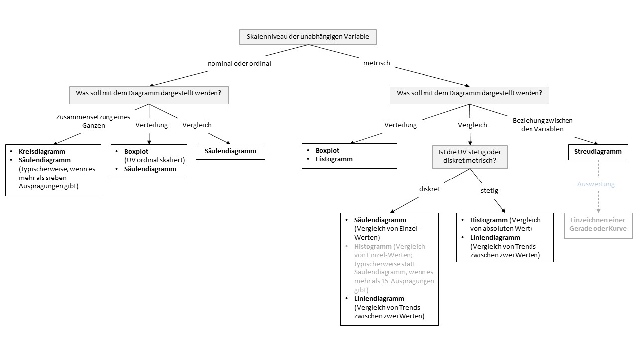 Sobald man sich über das Skalenniveau der Variablen und den Zweck der Darstellung bewusst ist, kann man mit Hilfe dieser nach einem geeigneten Diagrammtyp suchen. Eine mögliche Entscheidungshilfe ist im Folgenden abgebildet. Wichtig ist dabei jedoch zu betonen, dass es in der Regel nicht den einen richtigen Diagrammtyp gibt, sondern dass häufig mehrere Diagrammtypen möglich sind.