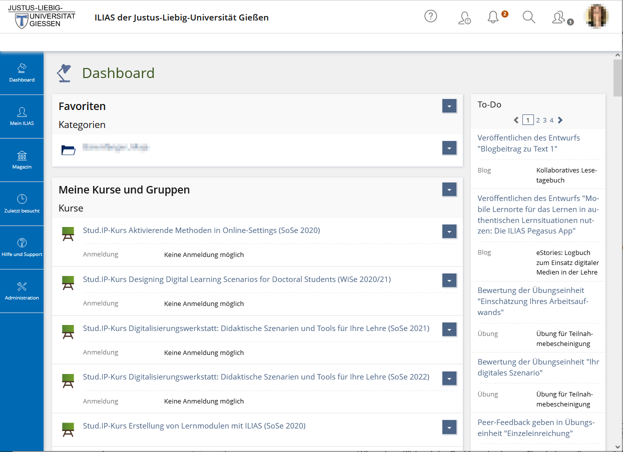 Persönliche Einstiegsseite in ILIAS (Dashboard)