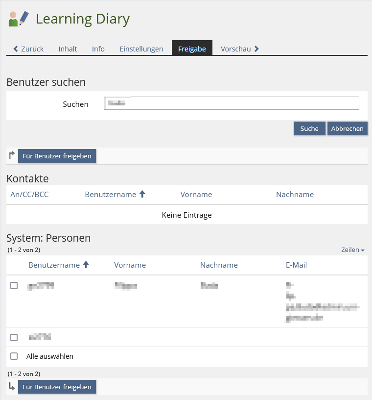 Ihnen werden jetzt Benutzer*innen angezeigt, die Ihren Suchkriterien entsprechen. Wenn Sie ein oder mehrere Benutzer*innen auswählen (Häkchen setzen) und dann auf den Button "Für Benutzer freigeben" klicken, haben Sie Ihre Ressource freigegeben.