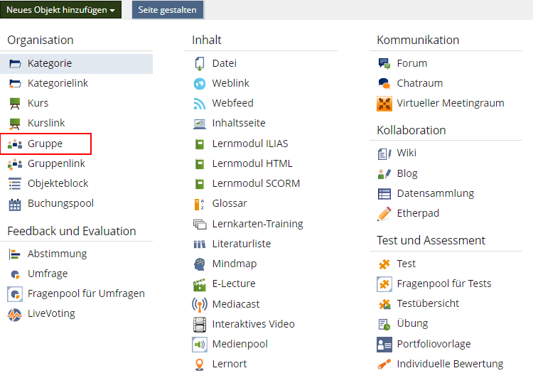 Wie Sie eine Gruppe für verschiedene Szenarien der gemeinsamen Zusammenarbeit einstellen können, wird Ihnen auf der Hilfeseite zur Gruppe in den "Tipps und Tricks" erklärt: "Welche Rechte haben meine Studierenden in Ihrer Gruppe bzw. wie kann ich eine Gruppe für kollaboratives Arbeiten einrichten?".