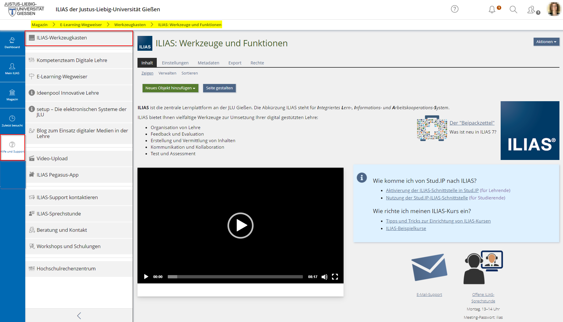 Im oberen Bereich des Werkzeugkastens befindet sich ein kurzes Einführungsvideo zu ILIAS. Darüber hinaus finden Sie hier zentrale Informationen, wie Sie von Stud.IP nach ILIAS kommen und wie Sie einen ILIAS-Kurs einrichten.