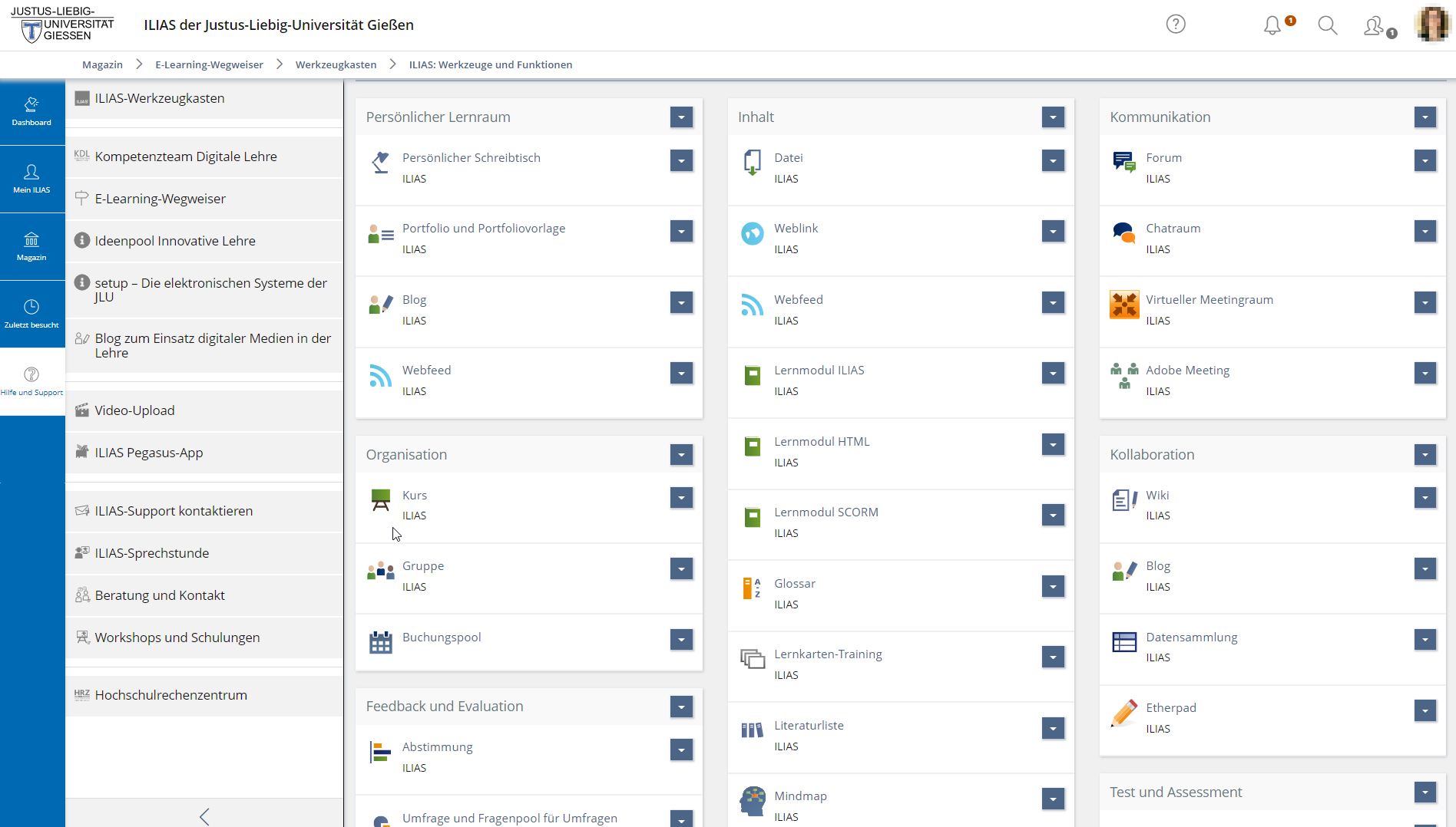 Im ILIAS-Werkzeugkasten der JLU finden Sie Informationen, Anleitungen, Videotutorials, Beispiele und Tipps und Tricks zu nahezu allen verfügbaren ILIAS-Objekten.