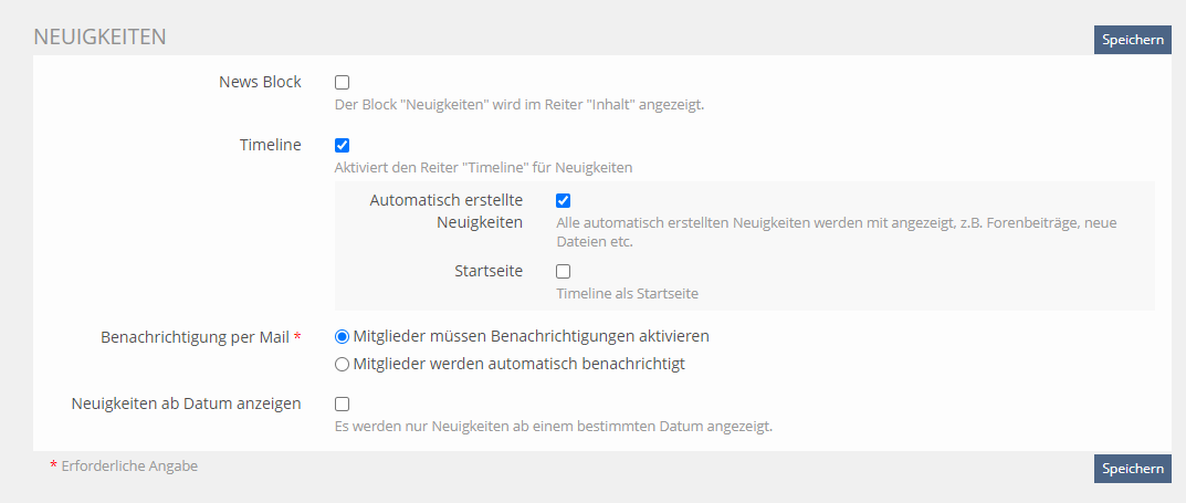 In den Einstellungen zu den Neuigkeiten, können Sie zwischen zwei Darstellungen wählen, einem "Neuigkeiten-Block" (engl. News Block) und der "Timeline"-Funktion.