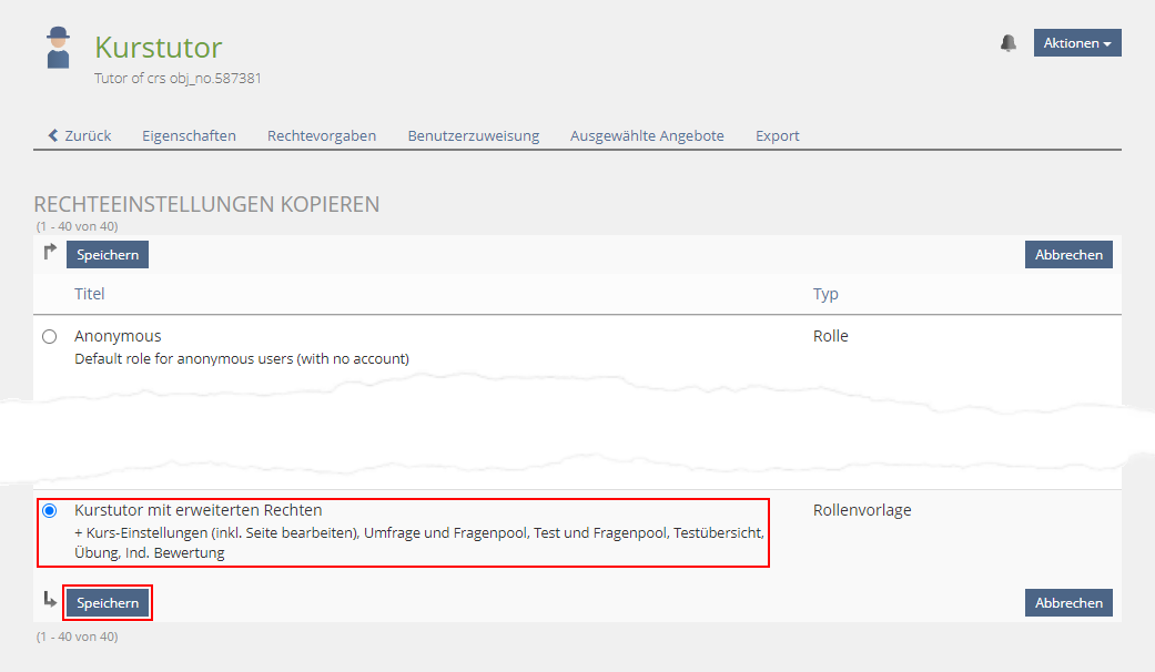 Rollenvorlage "Kurstutor mit erweiterten Rechten" auswählen und Auswahl speichern