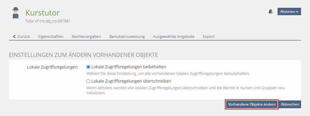 Ggf. "Lokale Zugriffsregelungen beibehalten" auswählen und mit der Schaltfläche "Vorhandene Objekte ändern" bestätigen (diese Nachfrage wird nur dann angezeigt, wenn der Kurs bereits Objekte enthält)
