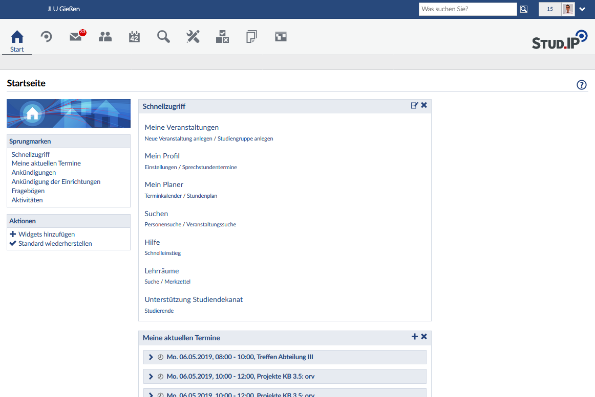 Anders als in FlexNow gibt es hier eine Fülle von Funktionen, die dich während des gesamten Semesters begleiten. Über Stud.IP werden u.a. Dateien zum Herunterladen angeboten, Hausarbeiten eingesammelt, der elektronische Semesterapparat des Bibliotheksystems angebunden und Neuigkeiten zu Lehrveranstaltungen (Raumänderung etc.) bekannt gegeben. Darüber hinaus gibt es weitere interessante Features wie z. B. ein virtuelles Schwarzes Brett für Kleinanzeigen, eine Pinnwand, Umfragen oder eine Sprechstundenanmeldung. Auch Fachschaften nutzen Stud.IP bereits intensiv für den Austausch von Informationen.