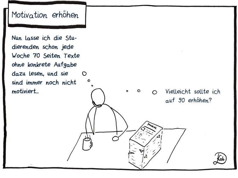 Um die Motivation von Studierenden zu stärken, ist es wichtig, dass diese die Erfahrung von Selbstwirksamkeit und dem Erleben der eigenen Kompetenz machen. Ein zentrales Element hierfür ist Feedback. Studierende müssen ihre eigene Kompetenz realistisch einschätzen können: oftmals halten Studierende sich für weniger kompetent, als sie sind, und geben auf. Oder sie überschätzen sich und nehmen ihre Aufgaben nicht ernst genug – auch dann ist der Lernerfolg gefährdet.[2]