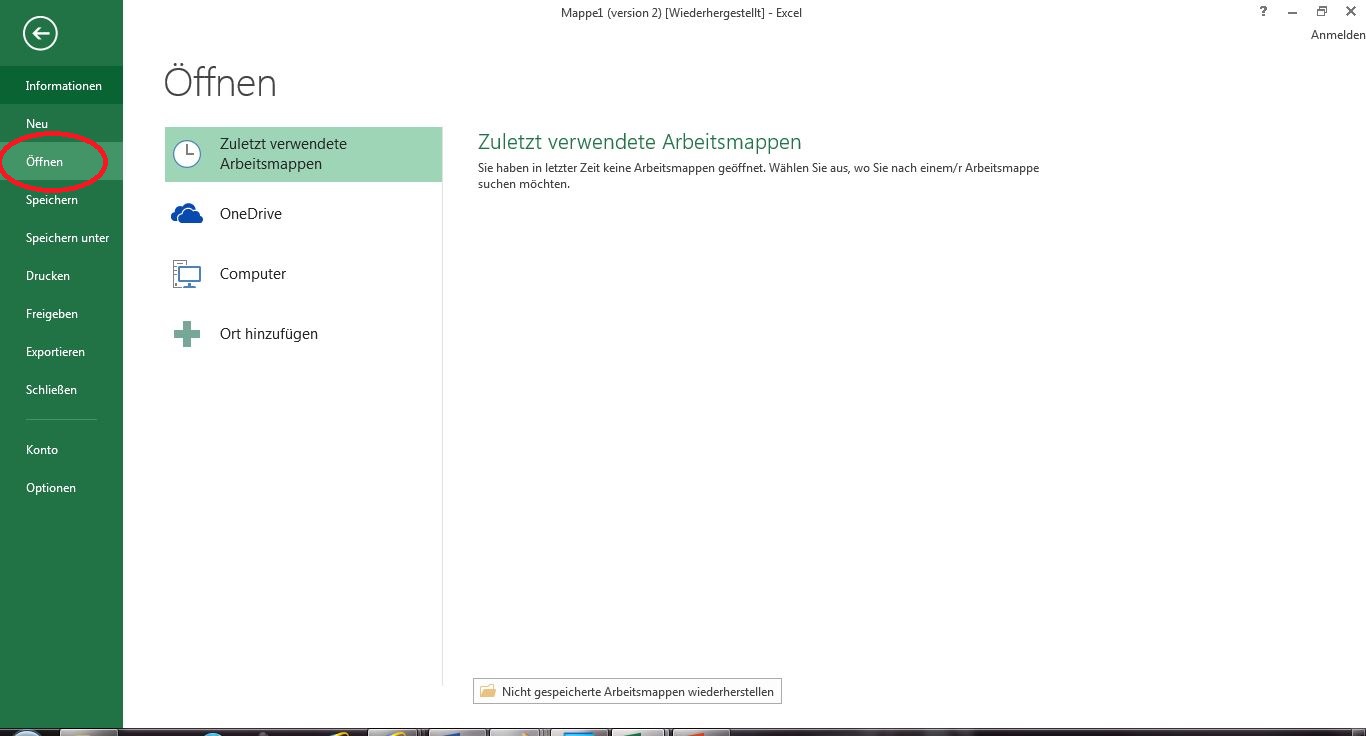 Um eine bereits bestehende Datei zu öffnen, nutzen Sie auf der Registerkarte "Datei" die Auswahlmöglichkeit "Öffnen" und wählen dann die gewünschte Datei aus. Sie können dabei auf unterschiedliche Speicherorte, z. B. auf Ihrem Computer oder in der Cloud (OneDrive), zugreifen. Unter "Zuletzt verwendete Arbeitsmappen" werden Ihnen zudem die Mappen angezeigt, die Sie kürzlich bearbeitet haben, so dass Sie bei Bedarf direkt an diesen weiterarbeiten können, ohne den Speicherort suchen zu müssen.