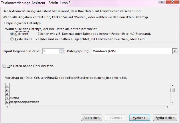 Indem Sie abschließend "Fertig stellen" anklicken, wird Ihr Textdokument in Excel eingefügt.