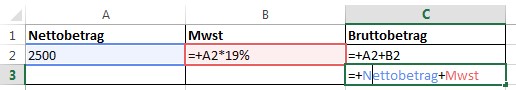 Hier sehen Sie den Unterschied zwischen der Formel mit den Zellbezügen und der Formel mit den entsprechenden Namen. Durch die Namensvergabe werden die Formeln übersichtlicher und sind leichter zu lesen.