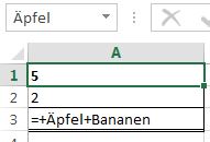 Hier wurde die Zelle A1 in "Äpfel" umbenannt – Sie sehen es am Namenfeld. A2 wurde "Bananen" genannt. Nun lautet die Formel statt "A1*A2" "Äpfel*Bananen". Dies ist jetzt ein sehr simples Beispiel. Je nachdem, in welchem Umfang Sie Formeln in Excel verwenden wollen, hilft Ihnen die Namensvergabe, den Überblick zu behalten.