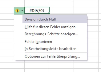 Erinnern Sie sich an das Kapitel, in dem Sie gelernt haben, wie man Zahlen in Text umwandelt? Dort haben Sie bereits das kleine grüne Dreieck kennengelernt, über das Excel Ihnen einen Fehler anzeigt. Wenn Sie die fehlerhafte Zellen anklicken, wird Ihnen ein Warnsymbol angezeigt, über welches Sie ein Drop-down-Menü öffnen können, in dem Ihnen u. a. die Excel-Direkthilfe angeboten wird. Bei größeren Formeln sind auch die dort angebotenen "Optionen zur Fehlerüberprüfung" hilfreich.
