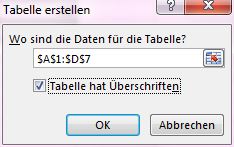 Wählen Sie die Daten aus, hier sind es die Zellen A1 bis D7, und setzen Sie einen Haken bei "Tabelle hat Überschriften". Bestätigen Sie diese Eingabe. Jetzt sieht Ihre Tabelle so aus: