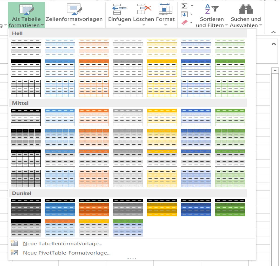 Markieren Sie die Datenliste und wählen Sie im Register "Start" in der Gruppe "Formatvorlagen" den Befehl "Als Tabelle formatieren" aus. Dabei müssen Sie sich für eines der vorgegebenen Tabellenformate entscheiden.
